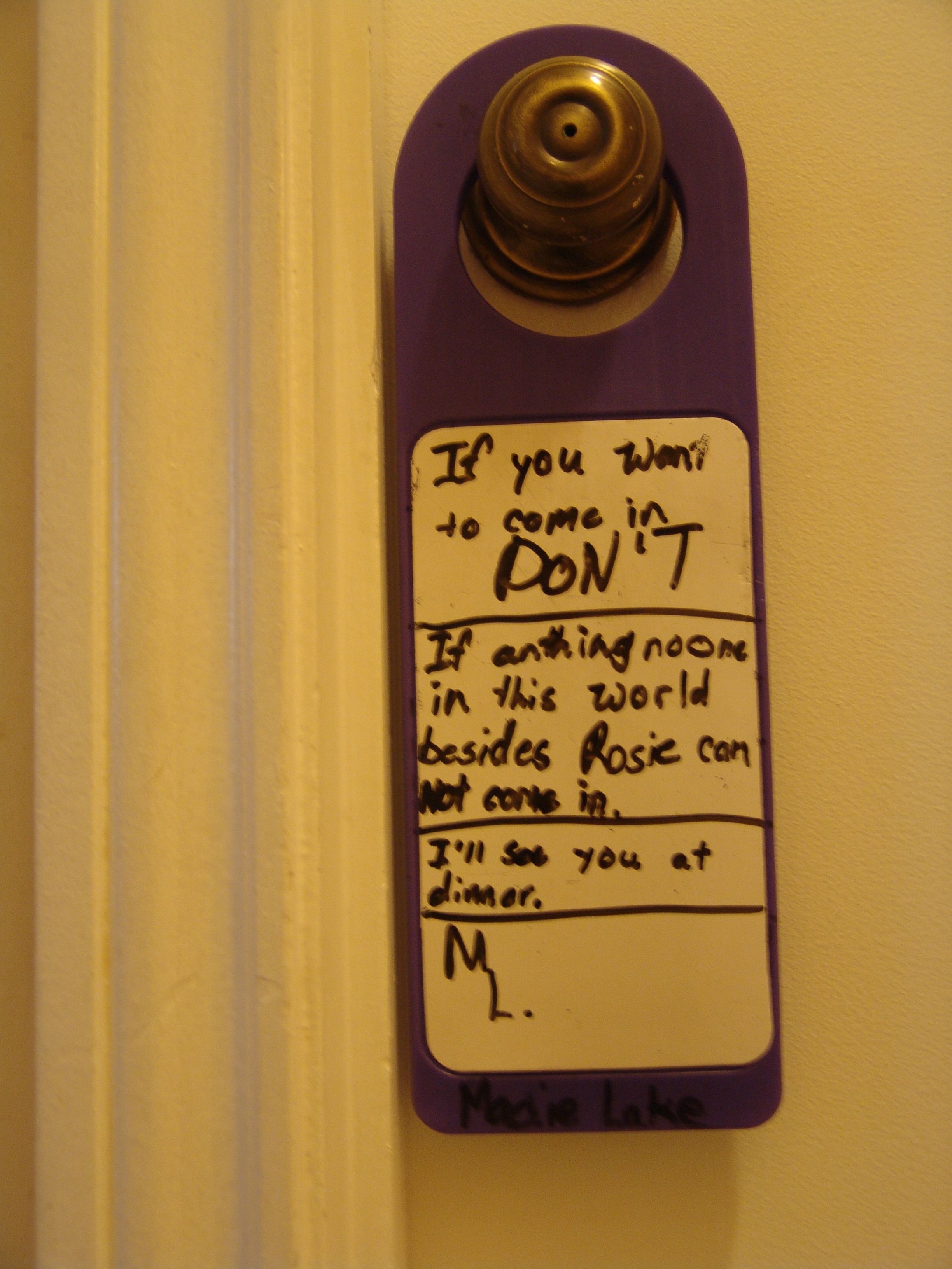 I could honestly kill the person who gave Madie this dry erase board for Christmas. She is communicating way to much. Now I have to knock before I can go it . . . just because the note says so. She was a little mad at me when she wrote this note. I just had to take a picture of it.