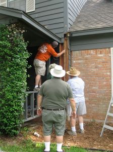 My poor house has gone under a major reconstruction. We had put off the repairs long enough, but they had to happen. God truly blessed our week of home repairs! The weather was lovely and cool. And He sent many hands to help with this huge undertaking. We certainly could not have afforded to have paid anyone to do it. But many came and helped to repair the rot and put the Hardiplank up. It is a pale yellow color right now (that’s the color of the primer on the boards), but it will soon return to its original gray color. My poor husband is tired. I’m tired (and I didn’t even do any of it). I’m glad the project will be finished soon. Chris just has to put the trim work up and then it will be done.