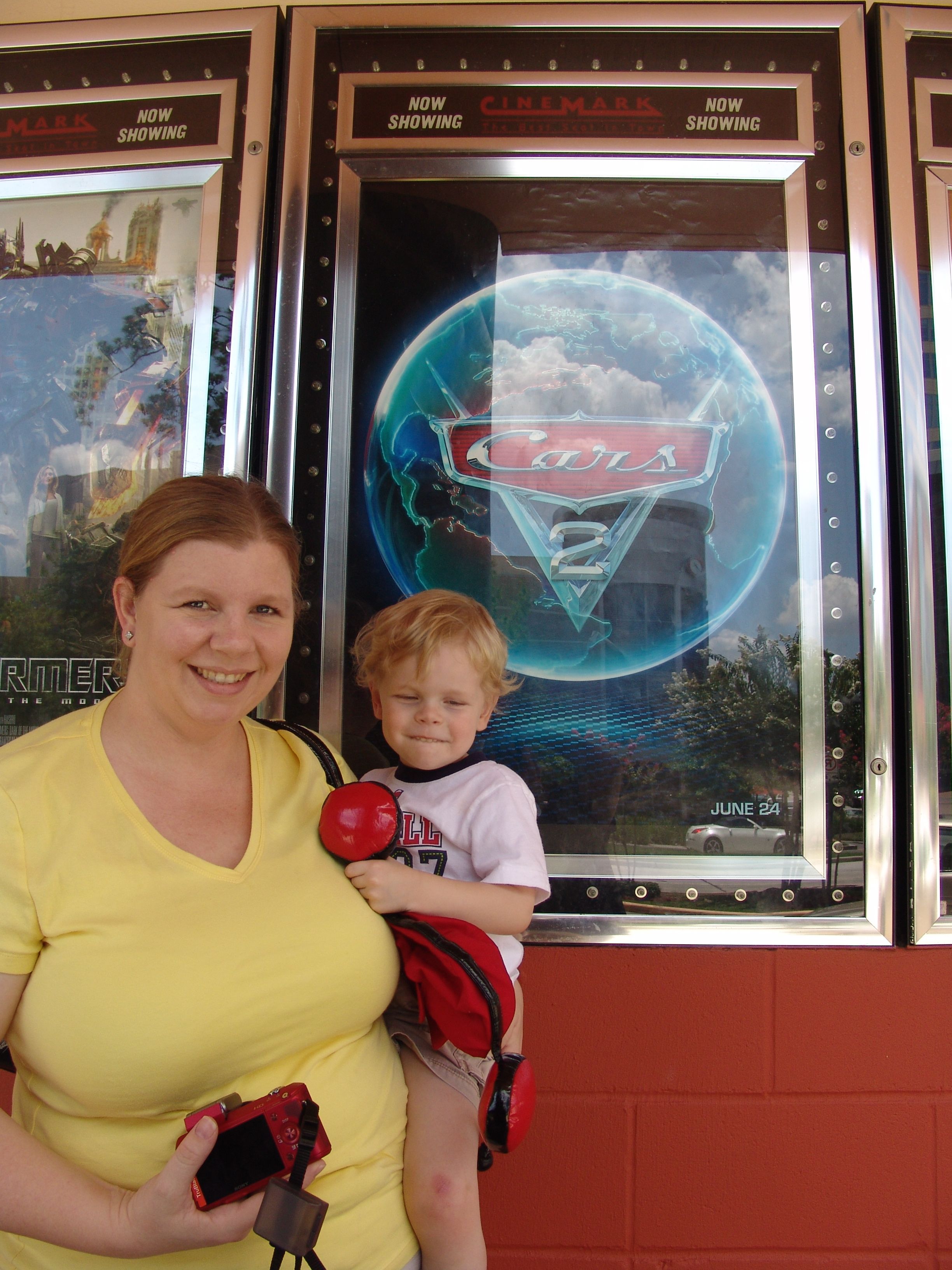 We met Aunt Debra and Gordon at the local theatre to watch Cars 2 in 3D. I promised the kids that we could see this movie in 3D before I asked if Gordon would want to go with us. But Gordon did great. He kept the glasses on for most of the film. He never fussed and was really really good.