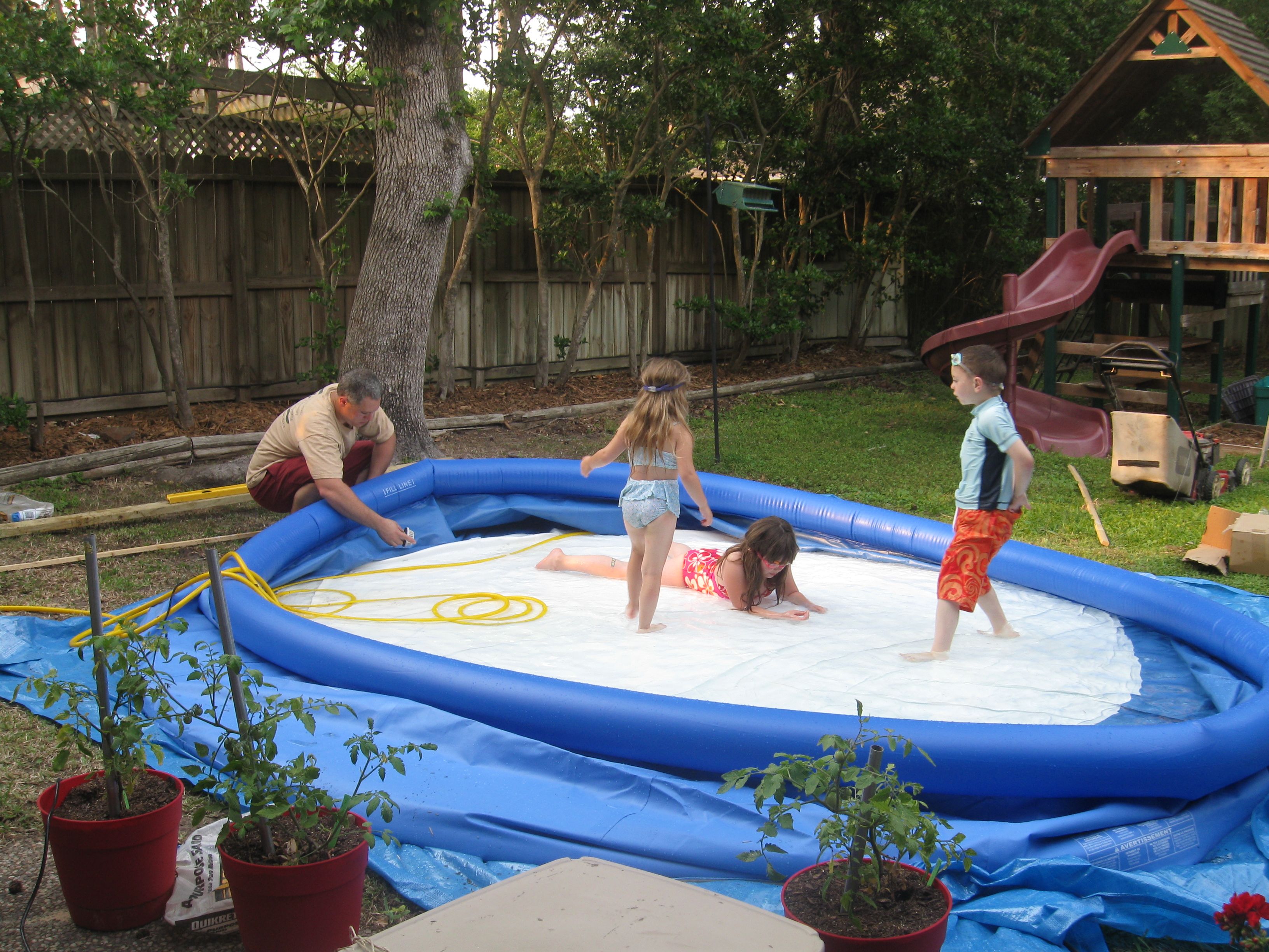 It was a great start to a cool pool. But after three overflows, we put a halt on refilling it again until we could figure out why. Turns out our yard has a huge slope. So big, in fact, that it has proven impossible to put a pool this size in our yard. We looked into leveling out the pool with sand or cutting the yard with a sod cutter. But we would destroy the yard in the process. So no pool for Ben. or Madie. or Ainlsey. or Mommy. This stinks. This was suppose to help me out this summer. To no avail! We have found other ways to distract the children the summer. Now we just have to figure out what to do with the large behemoth of a pool . . .