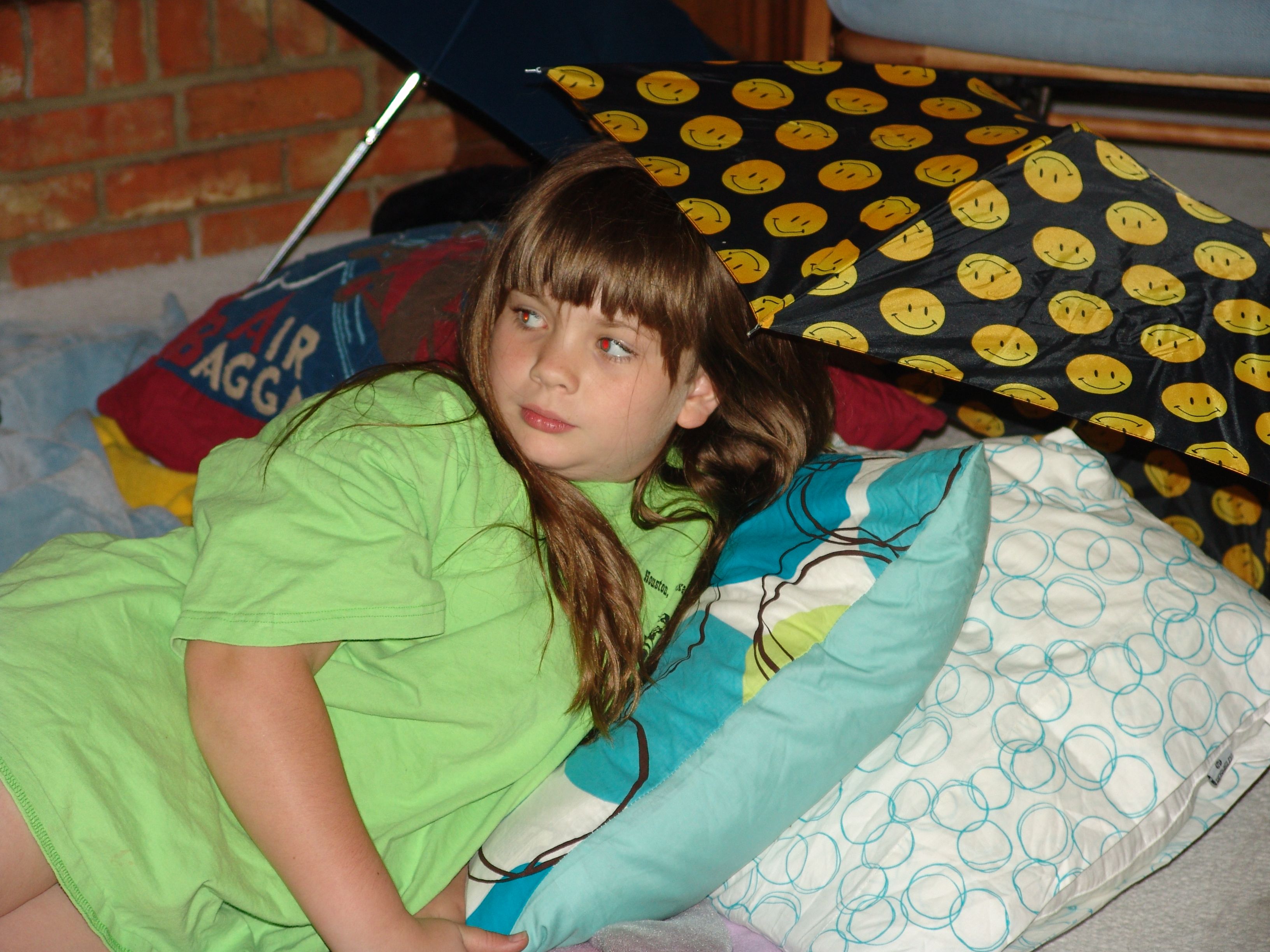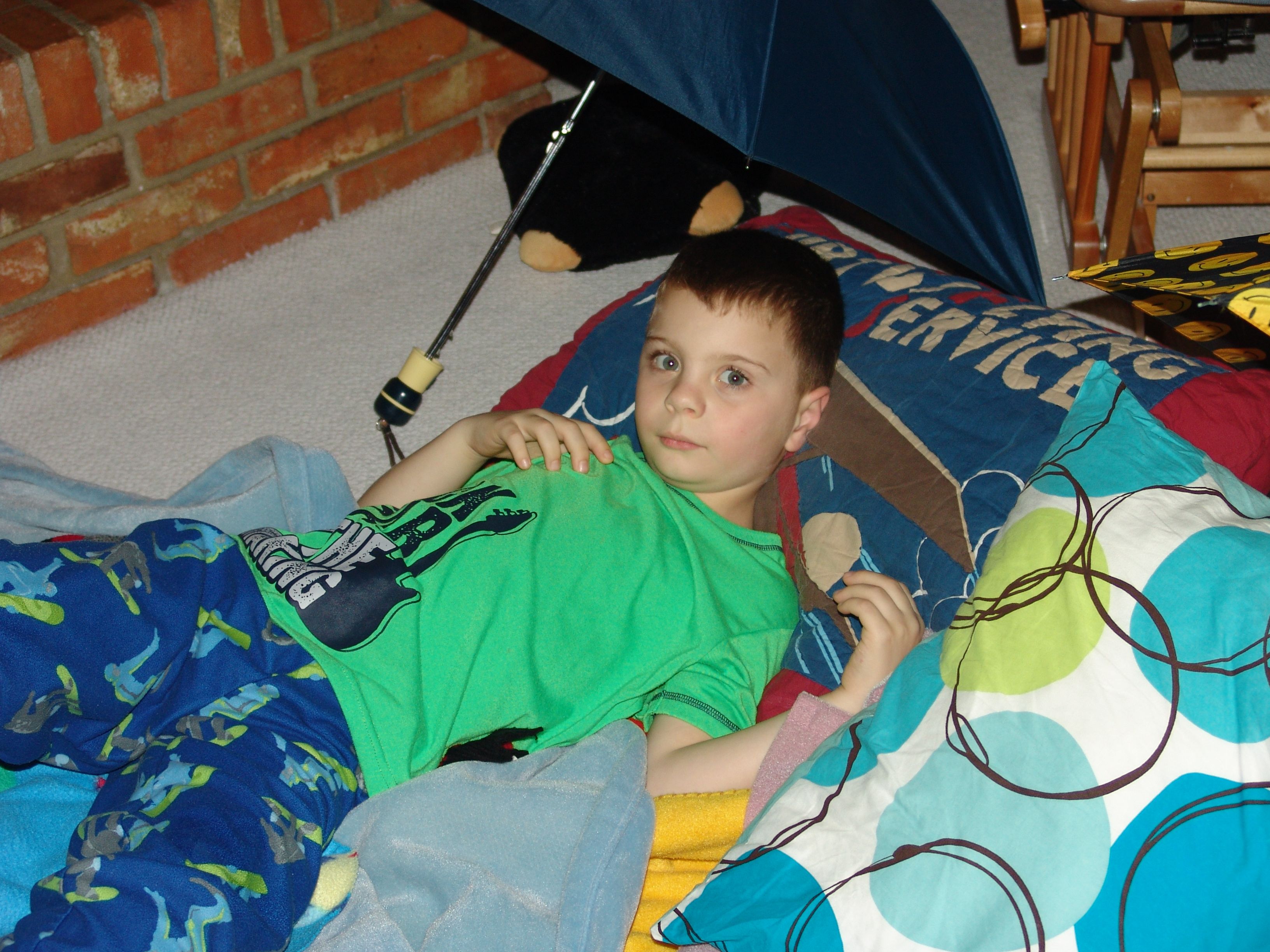 The kids decided to have a slumber party this week in the living room. They set up there sleeping pallets and felt the need to have umbrellas at each of their spots. It was sweet.