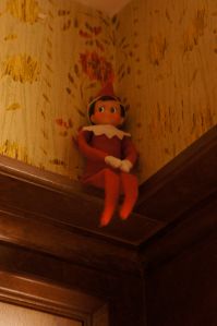 Fuzzy, the elf. And he is particularly mischievous this year. I think it is going to be fun this year with the elf. Today we found him sitting in the corner of the kitchen. I wonder where he will turn up tomorrow!