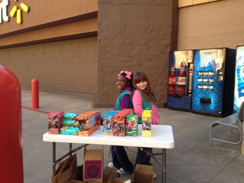 We just spent 4 hours at Walmart selling cookies. We sold a ton of cookies! So much that we nearly sold out of everything that we had. So the cookie mom and I went and got 86 cases of cookies just to get through the weekend (there are 5 more booths this weekend).