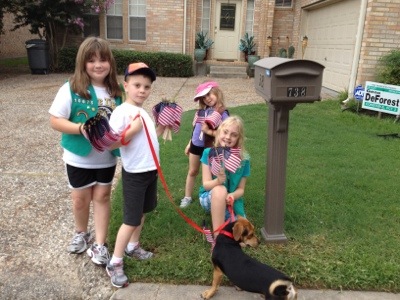 Yesterday we volunteered to put up almost 150 flags around the neighborhood. We decided to take the dog with us on the journey. That was fun. After he reacted to another dog coming towards us, Madie said, “Well that was a Hank move if we’ve ever seen one.” We had been debating a new name for the dog. Ben andChris liked Hank after our favorite series of books, Hank the Cowdog. He truly has a lot of Hank in him!