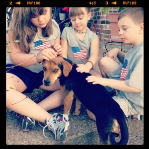 A friend of ours sent us a picture of this cute dog this week and the picture finally convinced Chris to say yes to a dog. We did some investigating and found out that the dog would be at the shelter today from 9-6 (it was currently in a foster home). He decided that he would go after church and scout out the dog. He would only call us if this was a good fit and he thought it would be ok. Well. By the time we got out of church and he got over there, the first dog was adopted. But then Chris found Muttley. He is a beagle/bassett hound/pug mix (his tail is ALL pug). He called me to bring the kids. When we got there Chris was walking the dog and the kids were out of the car before I knew what happened. I had preached to them the entire way over to the shelter that this was just a test and there was no guarantee we would come home with a dog. I must have been pretty stern because Ainsley asked me if we said no if she was allowed to tell the dog goodbye.