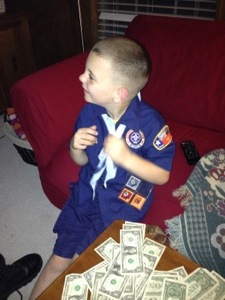Ben earned money by reading books at school. A car dealership in town offered it as an incentive. Ben came home and insisted on counting all of the money. In the second picture you can see the joy on his face when e realizes how much money he’s earned. He is pulling off his neckerchief just like I see daddy do when he’s had a hard day at work and he’s pulling off this tie. His teachers worked really hard to help him succeed in this project. Ben’s smile is thanks to them.