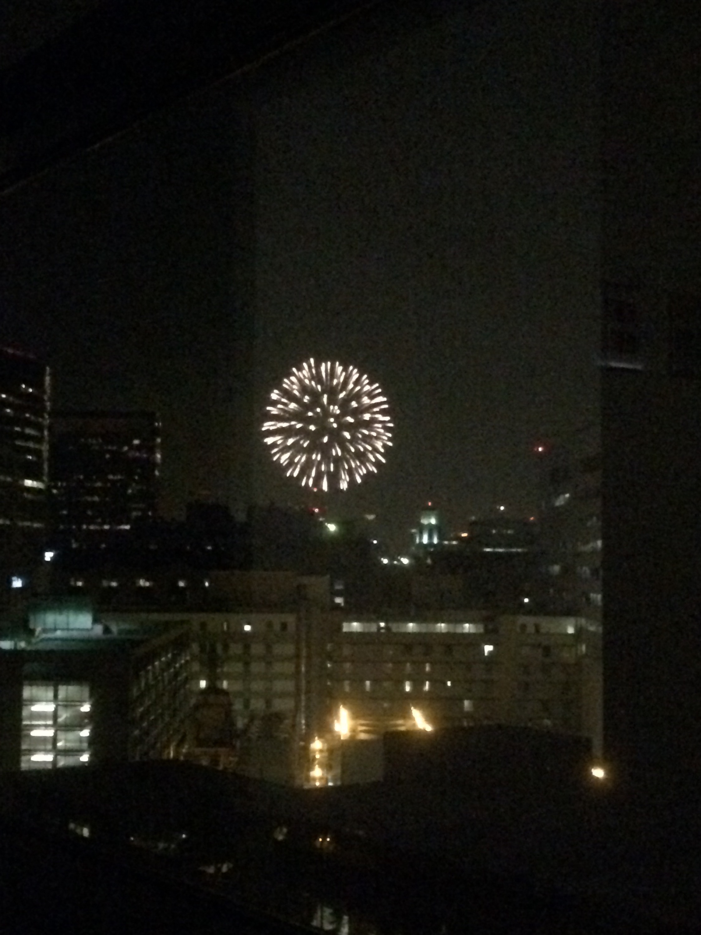 But we could see all of the high fireworks. Ben and I talked which ones we like the best. The nurse came in to give him more medicine and take more blood, then he saw our view and joined us in the running commentary of how awesome the fireworks were. He liked the same ones that Ben does, the multi-colored ones.