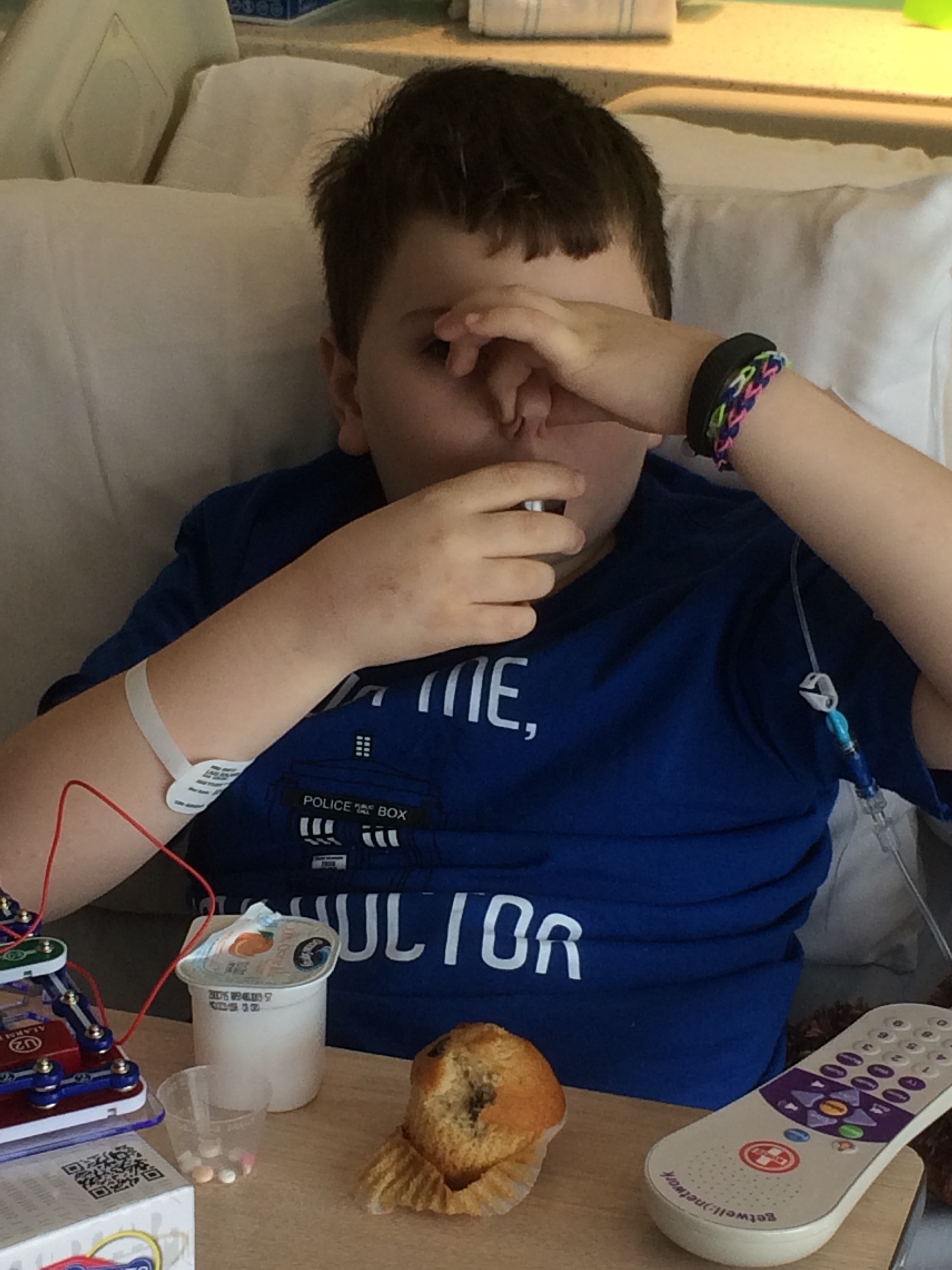 The boy is patiently waiting for ultrasound tests. He just finished the CT scan and is happy to have the hardest one out of the way.
